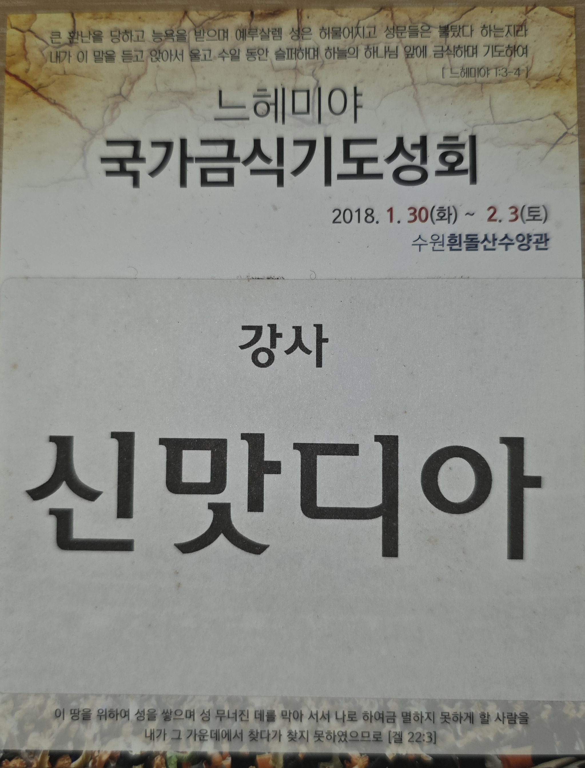 2018.01.30.~02.03. 흰돌산수양관 느헤미야 국가금식기도성회 강사 이영환원로목사님과 함께 저도 강사였는데 저 간증중에 여목사님께서 하나님의 음성을 듣고 5,000만원을 후원하시고 그 후 세분의 목사님께서 함께 순종하셔서 2019.07.04. 일억이 약간 넘는 금액으로 준공되었습니다.