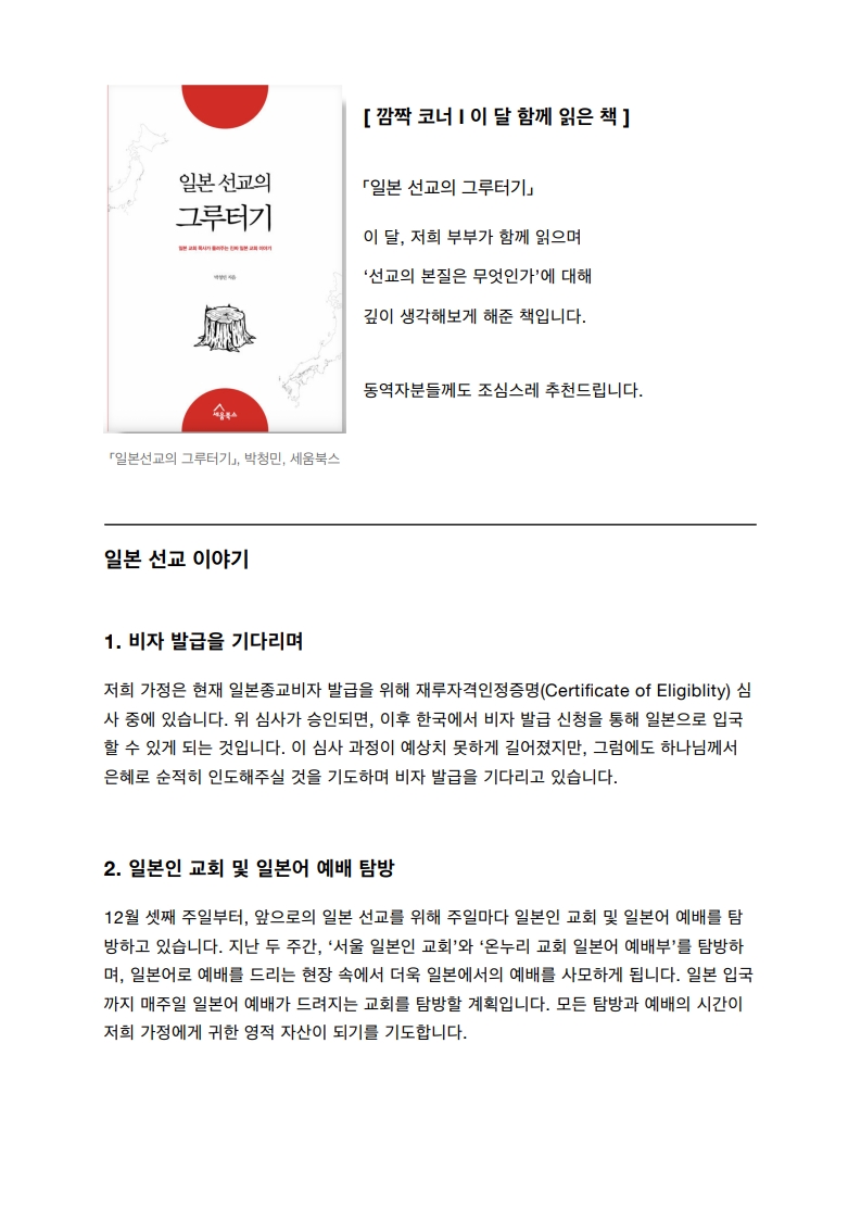 [해외선교소식] <일본> 박형준 선교사님 소식입니다.