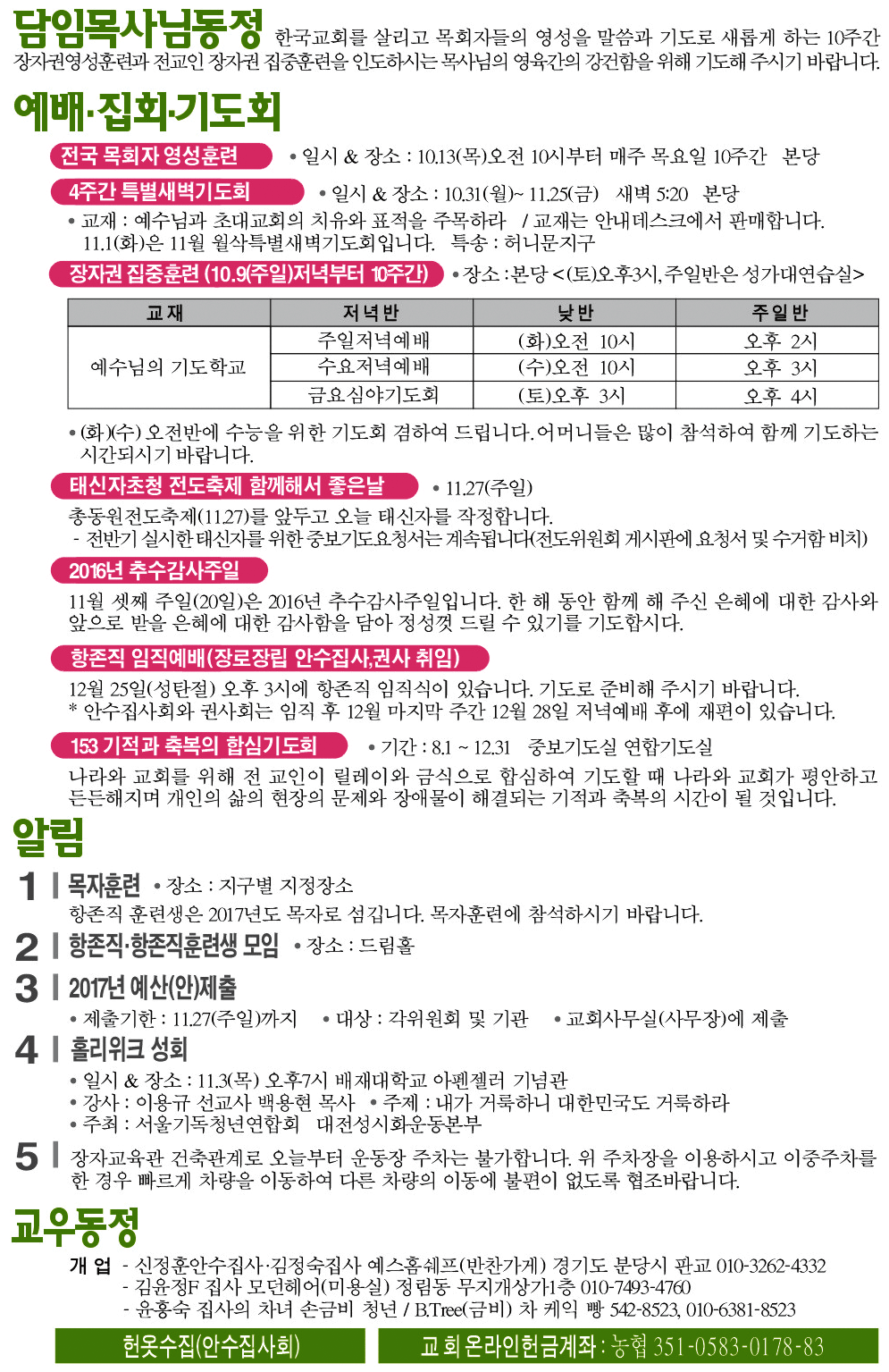 2016년 10월 30일 교회소식