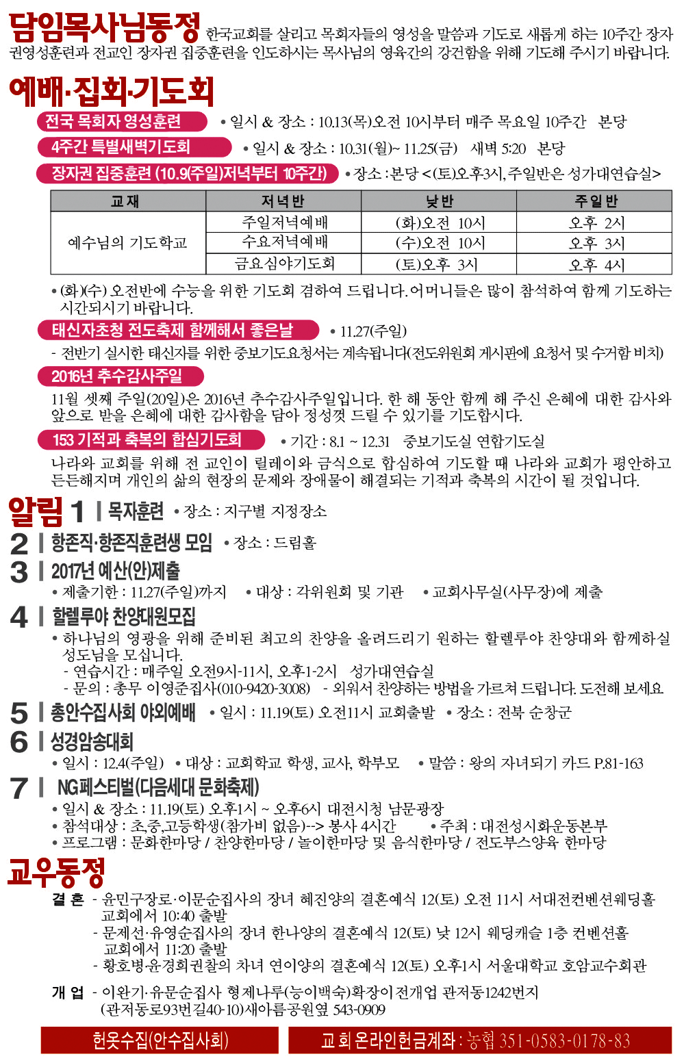 2016년 11월 6일 교회소식