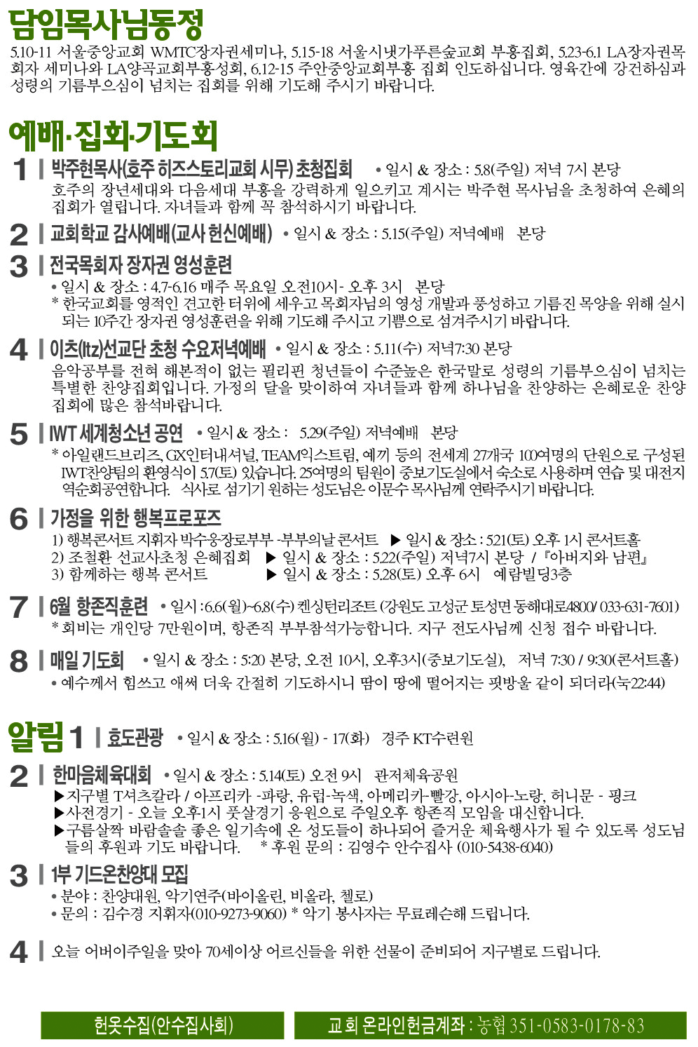 2016년 5월 8일 교회소식