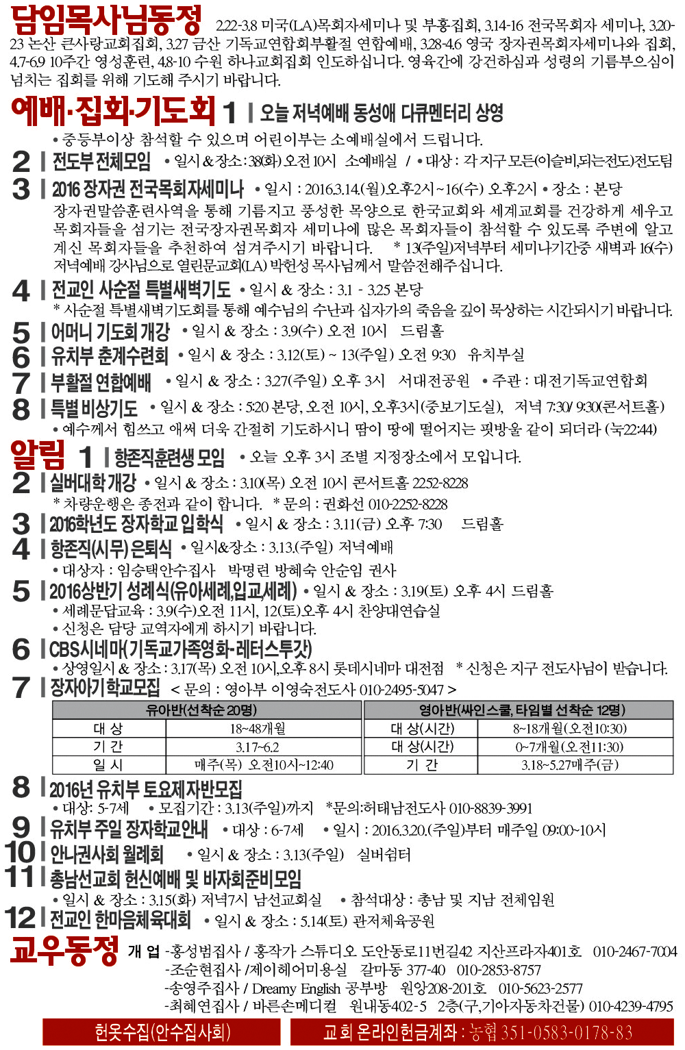 2016년 3월 6일 교회소식